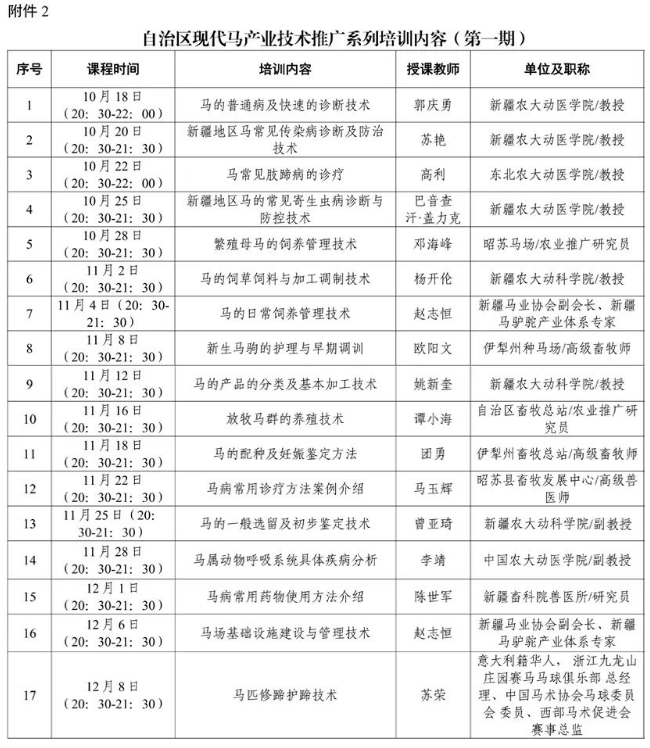 下附本期自治區(qū)現(xiàn)代馬產(chǎn)業(yè)技術(shù)推廣系列培訓(xùn)課程內(nèi)容及時間安排,大家記得關(guān)注哦!