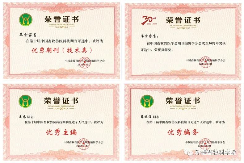 近日,由中國畜牧獸醫(yī)學(xué)會(huì)期刊編輯學(xué)分會(huì)組織的“第十屆中國畜牧獸醫(yī)科技期刊精品(優(yōu)秀)期刊、優(yōu)秀團(tuán)體、先進(jìn)個(gè)人評選活動(dòng)動(dòng)”和“中國畜牧獸醫(yī)學(xué)會(huì)期刊編輯學(xué)分會(huì)成立30周年之表彰活動(dòng)”評選結(jié)果揭曉,由新疆畜牧獸醫(yī)學(xué)會(huì)會(huì)長單位——新疆畜牧科學(xué)院主管、主辦的《草食家畜》期刊榮獲第十屆全國畜牧獸醫(yī)科技期刊“優(yōu)秀期刊獎(jiǎng)”和“30周年貢獻(xiàn)獎(jiǎng)”,編輯部王惠同志榮獲“優(yōu)秀主編”稱號(hào),薛曉波同志榮獲“優(yōu)秀編務(wù)”稱號(hào)。