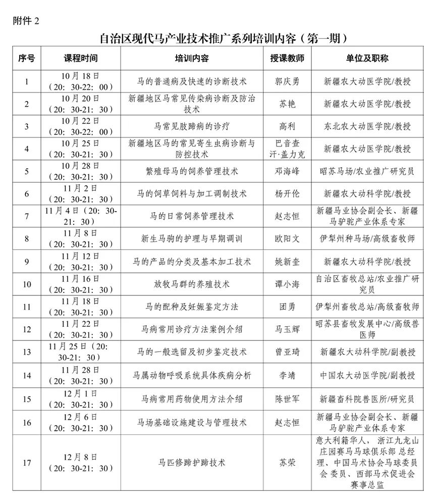 下附本期自治區現代馬產業技術推廣系列培訓課程內容及時間安排,大家記得關注哦!