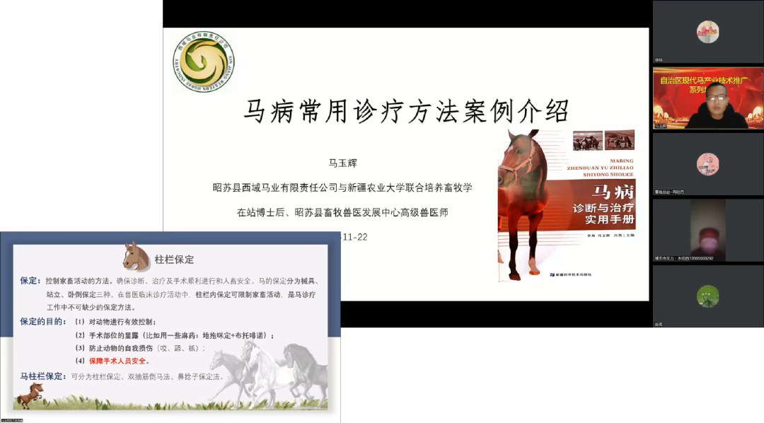 11月22日——馬病常用診療方法案例介紹,由昭蘇縣畜牧發展中心馬玉輝老師授課,全方面地講述頸靜脈輸液、柱欄保定技術、鼻胃管技術以及臨床一些病癥的解析和治療方法。