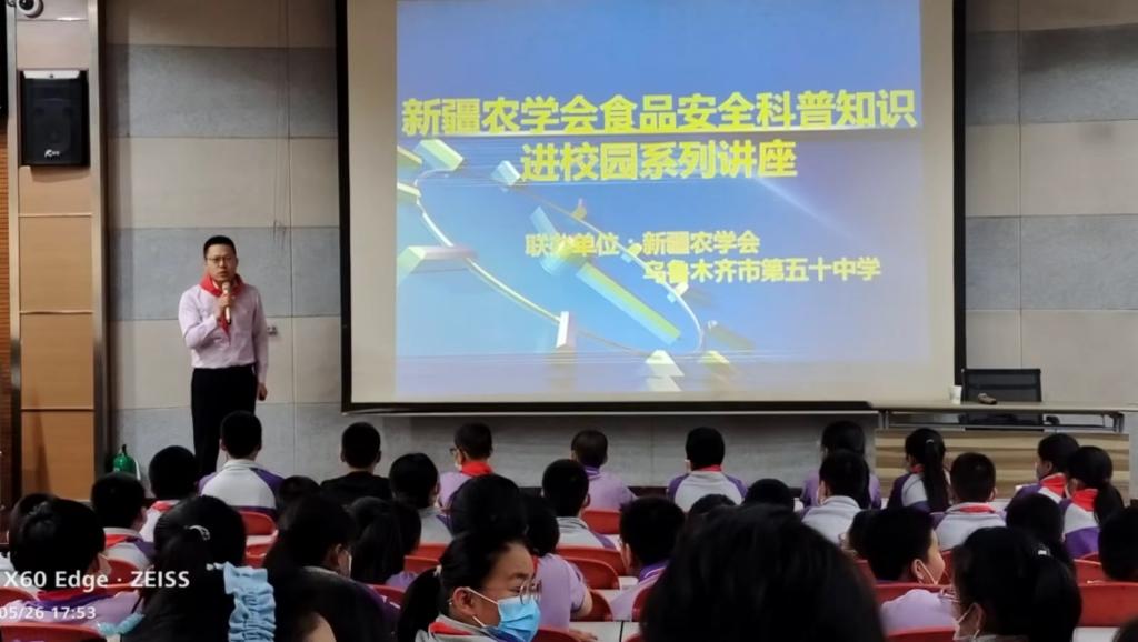 5月26日下午,伴隨著校園里鑼鼓震天,“新疆農學會食品安全科普知識進校園”活動正式拉開帷幕。本次活動由新疆農學會、烏魯木齊市五十中學聯合舉辦,學會邀請了新疆農業科學院農業質量標準與檢測技術研究所趙多勇博士做科普講座,200余位小學六年級師生參加了本次活動。