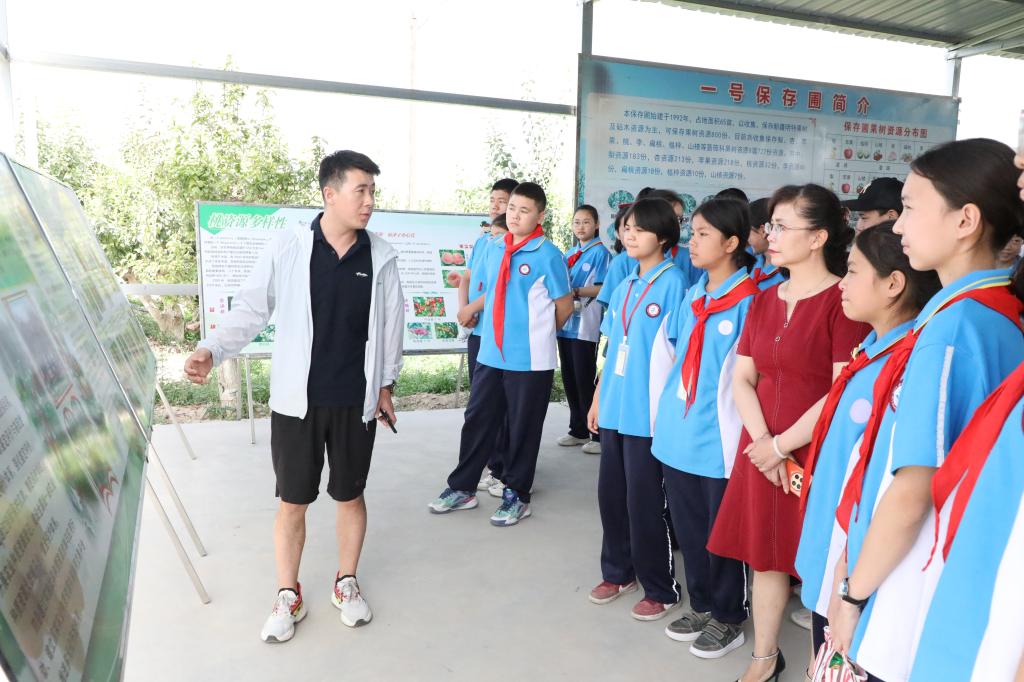 活動中,輪臺果樹資源圃科技人員、新疆園藝學會專家結合展板向同學們介紹了果樹的分類,講解了果樹種質資源的重要性和多樣性以及在培育果樹新品種過程中的艱辛歷程,使學生們對果樹種質資源的保護和多樣性以及從事果樹相關研究的工作內容等方面有了初步了解。隨后,講解人員帶領著輪臺縣第二中學的師生穿行于茂盛果林之中,與果樹近距離接觸,并結合果實具體形狀、大小、顏色等特點,為同學們上了一堂生動有趣的果林研學課,同學們在聽工作人員講解的同時,采摘品嘗綠樹濃蔭下的果實,在炎炎夏日中感受甜美的味道。