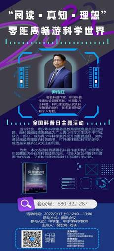 本次活動特邀請中國著名科普作家尹傳紅帶領(lǐng)青少年領(lǐng)略國內(nèi)外優(yōu)秀科普讀物風(fēng)采,引導(dǎo)大家如何做好科普圖書的閱讀,了解如何通過閱讀打開探索科學(xué)之路。尹傳紅是我國著名科普作家,后著有《幻想:探索未知世界的奇妙旅程》、《漫游》、《假象》、《吃的困惑》、《櫻桃樹上的夢想》、《時間旅?》等書。