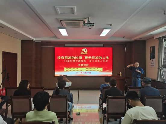 中國(guó)科學(xué)院新疆生態(tài)與地理研究所國(guó)家荒漠-綠洲生態(tài)建設(shè)工程技術(shù)研究中心主任、新疆地理學(xué)會(huì)理事徐新文研究員應(yīng)邀以《沒有荒涼的沙漠,更無荒涼的人生——30年扎根大漠瀚海 奮斗創(chuàng)造人間奇跡》為題,做了一場(chǎng)精彩的報(bào)告。徐老師結(jié)合自己豐富的防沙治沙工作經(jīng)歷,以中醫(yī)治病作比,全面系統(tǒng)形象地闡述了如何實(shí)現(xiàn)“因地制宜、因害設(shè)防”,重點(diǎn)結(jié)合塔里木沙漠公路防沙工程科研過程,講述輝煌工程業(yè)績(jī)背后科學(xué)家們攻堅(jiān)克難、創(chuàng)新進(jìn)取、嚴(yán)謹(jǐn)治學(xué)、求真務(wù)實(shí)的故事,體現(xiàn)了新疆一代代治沙科學(xué)家學(xué)以致用、服務(wù)國(guó)家的家國(guó)情懷。同時(shí),結(jié)合正在開展的防沙治沙實(shí)踐,與大家進(jìn)行探討交流。參會(huì)黨員同志感觸很多,收獲很多,深感“紙上得來終覺淺,絕知此事要躬行”,從掌握科學(xué)知識(shí)到靈活應(yīng)用還要下很多功夫!
