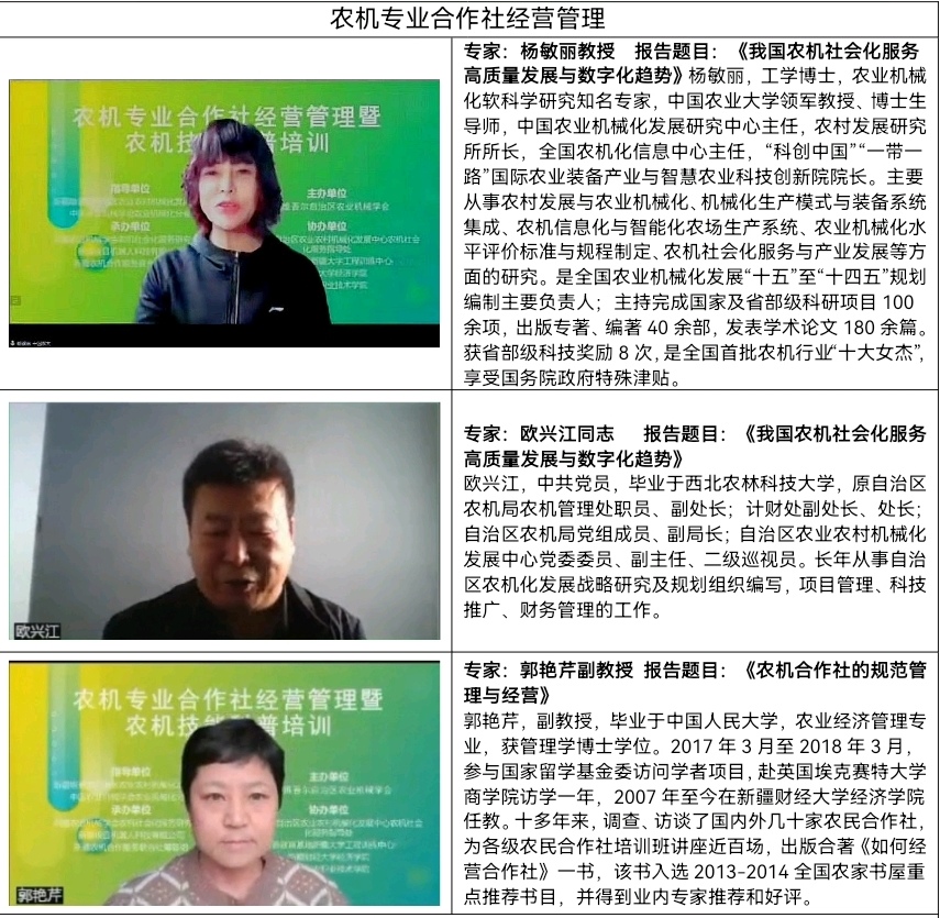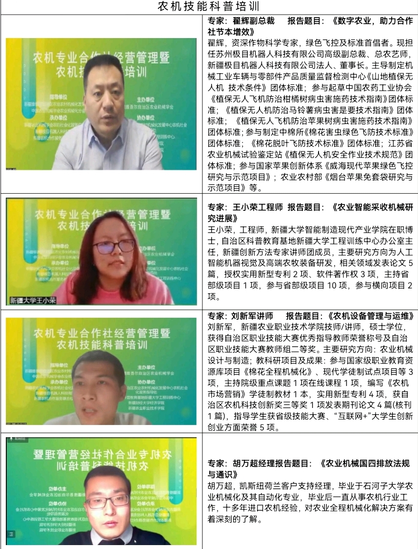圍繞大會“農(nóng)機專業(yè)合作社經(jīng)營管理暨農(nóng)機技能科普培訓”的主題,培訓設置了農(nóng)機專業(yè)合作社經(jīng)營管理專場和農(nóng)機技能科普培訓專場。農(nóng)機專業(yè)合作社經(jīng)營管理專場由中國農(nóng)業(yè)大學中國農(nóng)業(yè)機械化發(fā)展研究中心楊敏麗教授,新疆維吾爾自治區(qū)農(nóng)業(yè)機械學會監(jiān)事會主席歐興江,新疆財經(jīng)大學經(jīng)濟學院郭艷芹副教授圍分別就“我國農(nóng)機社會化服務高質(zhì)量發(fā)展與數(shù)字化趨勢”“加快農(nóng)機專業(yè)合作社發(fā)展,全提升農(nóng)機社會化服務水平”“合作社規(guī)范化經(jīng)營與管理”進行授課。農(nóng)機技能科普培訓專場由蘇州極目機器人科技有限公司高級副總裁、總農(nóng)藝師,新疆極目機器人科技有限公司法人、董事長翟輝,自治區(qū)科普教育基地新疆大學工程訓練中心辦公室主任王小榮,新疆農(nóng)業(yè)職業(yè)技術(shù)學院劉新軍,凱斯紐荷蘭客戶經(jīng)理胡萬超分別就“數(shù)字農(nóng)業(yè),助力合作社節(jié)本增效”“農(nóng)業(yè)智能采收機械研究進展”“農(nóng)機設備管理與運維”“農(nóng)業(yè)機械國四排放法規(guī)與通識”等相關(guān)內(nèi)容授課。