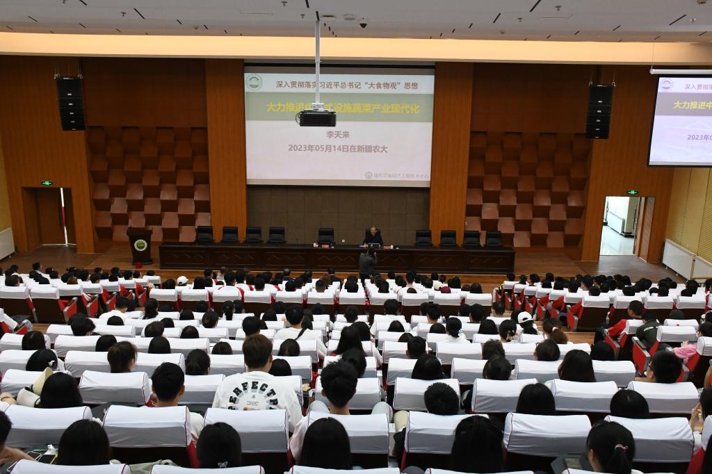 在全國上下扎實開展學(xué)習(xí)貫徹習(xí)近平新時代中國特色社會主義思想主題教育之際,新疆園藝學(xué)會聯(lián)合新疆農(nóng)業(yè)大學(xué)園藝學(xué)院邀請中國工程院院士李天來,于5月14日上午在新疆農(nóng)業(yè)大學(xué)舉行了學(xué)術(shù)報告和座談交流會,就我國和新疆的設(shè)施蔬菜產(chǎn)業(yè)的發(fā)展現(xiàn)狀、未來發(fā)展趨勢進行了報告和交流。報告會由新疆農(nóng)業(yè)大學(xué)校長蔣平安主持,400余名園藝科技工作者和園藝專業(yè)學(xué)生參加了此次活動。