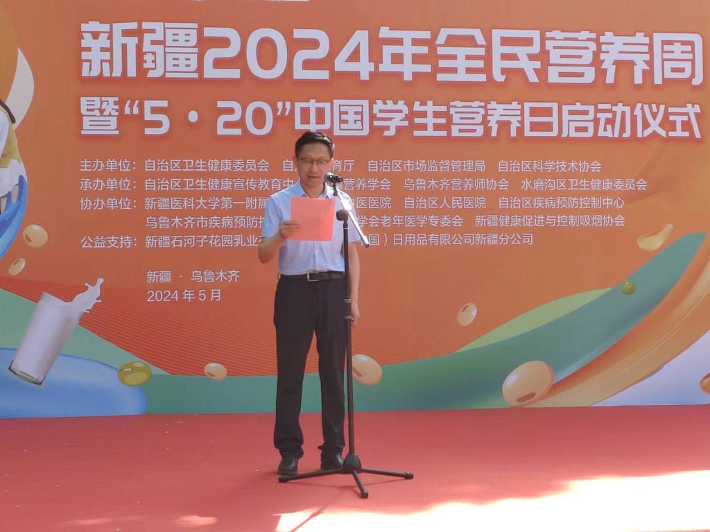新疆醫(yī)學會副會長、自治區(qū)衛(wèi)生健康行業(yè)新興組織黨委書記鄒小廣,自治區(qū)科協(xié)黨組成員、副主席擺曉宏,自治區(qū)市場監(jiān)督管理局二級巡視員彭繼東,自治區(qū)教育廳體衛(wèi)藝工作處四級調(diào)研員王倩分別在啟動儀式上致辭。新疆營養(yǎng)學會理事長李莉同志針對2024年全民營養(yǎng)周和5·20中國學生營養(yǎng)日傳播主題核心信息進行解讀。