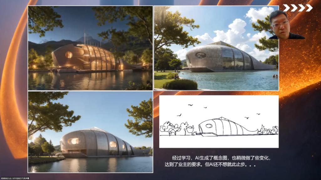 本次講堂主要圍繞“AIGC技術(shù)及開(kāi)展AI設(shè)計(jì)研究時(shí)間歷程”、“AIGC應(yīng)用時(shí)間案例”、“AIGC未來(lái)的發(fā)展方向”三大部分內(nèi)容展開(kāi)。據(jù)不完全統(tǒng)計(jì),2023年中國(guó)生成式AI市場(chǎng)規(guī)模約為14.4萬(wàn)億元,預(yù)計(jì)到2035年將突破30萬(wàn)億元,占全球總市場(chǎng)規(guī)模超過(guò)35%,隨著AI技術(shù)的不斷發(fā)展,中國(guó)生成式AI應(yīng)用目前集中于商業(yè)化發(fā)展成熟的優(yōu)勢(shì)產(chǎn)業(yè),如電商、傳媒、娛樂(lè)和游戲等,這些領(lǐng)域利用AI技術(shù)實(shí)現(xiàn)了快速發(fā)展和數(shù)字化轉(zhuǎn)型。而在近幾年AI技術(shù)也開(kāi)始在建筑設(shè)計(jì)領(lǐng)域逐漸嶄露頭角,如輔助方案創(chuàng)作與概念生成、智能高精度渲染、智能設(shè)備布置、智能管線(xiàn)排布、成本預(yù)測(cè)與風(fēng)險(xiǎn)緩解等方面,涵蓋了從方案創(chuàng)作到施工圖設(shè)計(jì)等多個(gè)方面,推動(dòng)建筑設(shè)計(jì)領(lǐng)域的創(chuàng)新和發(fā)展。高永峰老師著重通過(guò)對(duì)“控制性實(shí)踐”、“發(fā)散性實(shí)踐”、“室內(nèi)方案實(shí)踐”講述AI技術(shù)在方案設(shè)計(jì)領(lǐng)域所做出的貢獻(xiàn),憑借靈感手繪、實(shí)際生活中物品形狀、折紙形狀等初始狀態(tài)借助AI技術(shù)呈現(xiàn)出最終的建筑形態(tài)、室內(nèi)裝修效果、城市更新效果、方案比選等。