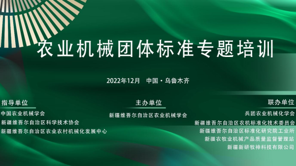 2022年12月15日,由新疆農業機械學會主辦的“農業機械團體標準專題培訓活動”以線上形式成功舉辦。新疆農業機械學會理事長、石河子大學陳學庚院士、新疆農業機械學會秘書長馬俊貴出席活動并致辭。