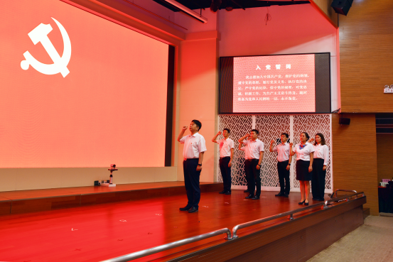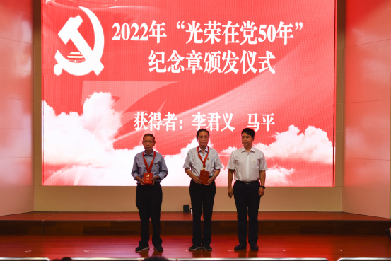 升旗儀式結束后,在自治區科協黨組書記、副主席王光強領誓下,舉行了新黨員入黨宣誓、全體黨員重溫入黨誓詞。接著,王光強為李君義、馬平同志頒發“光榮在黨50年”紀念章。