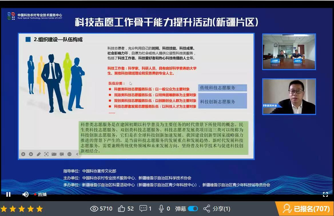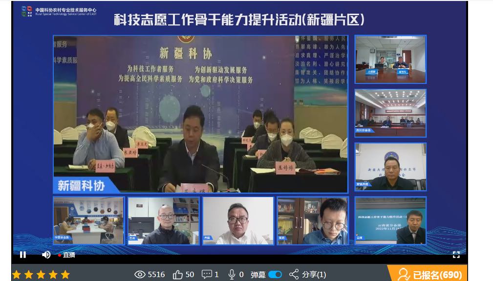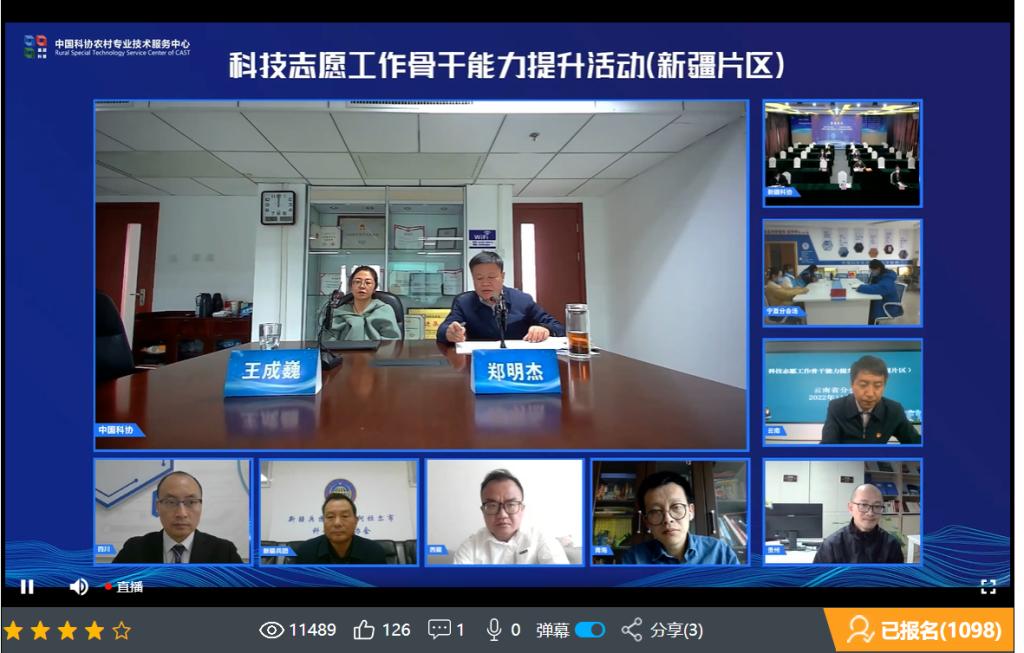 來自四川、貴州、云南、西藏、青海、寧夏、新疆及新疆生產建設兵團的8個省區骨干科技志愿者共1.5萬余人在線參加活動。新疆維吾爾自治區第十、十一屆人大常委會副主任、黨組副書記,新疆科協名譽主席、新疆老科技工作者協會會長張國梁,新疆科協黨組書記、副主席王光強及有關專家出席活動,中國科協農村專業技術服務中心副主任鄭明杰主持活動。