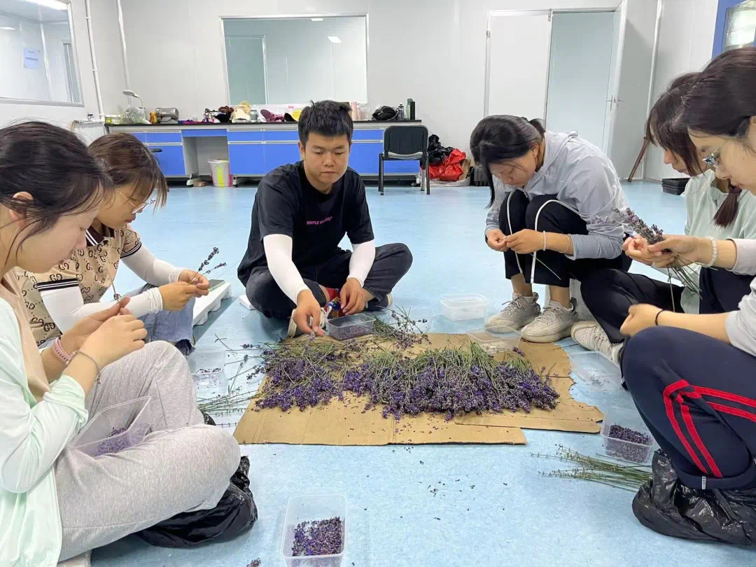 隨后,“薰衣草小隊”又來到企業薰衣草精油提取廠房開展調研。觀摩完薰衣草精油的提煉過程后,同學們提出了‘比較薰衣草機械化采收和人工采收的精油產率和品質’的科學問題,并隨即回到科技小院開展了比較試驗,同學們在調研中發現科學問題的過程里體會到了清晰的獲得感。