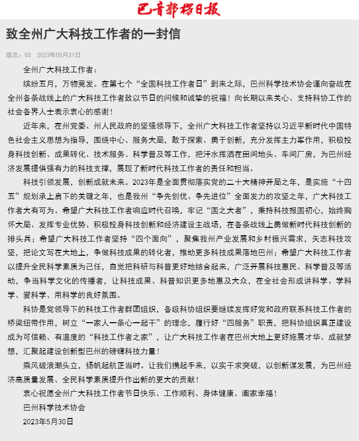 繽紛五月,萬物競發(fā)。在第七個(gè)“全國科技工作者日”到來之際,巴州科學(xué)技術(shù)協(xié)會(huì)謹(jǐn)向奮戰(zhàn)在全州各條戰(zhàn)線上的廣大科技工作者致以節(jié)日的問候和誠摯的祝福!向長期以來關(guān)心、支持科協(xié)工作的社會(huì)各界人士表示衷心的感謝!
