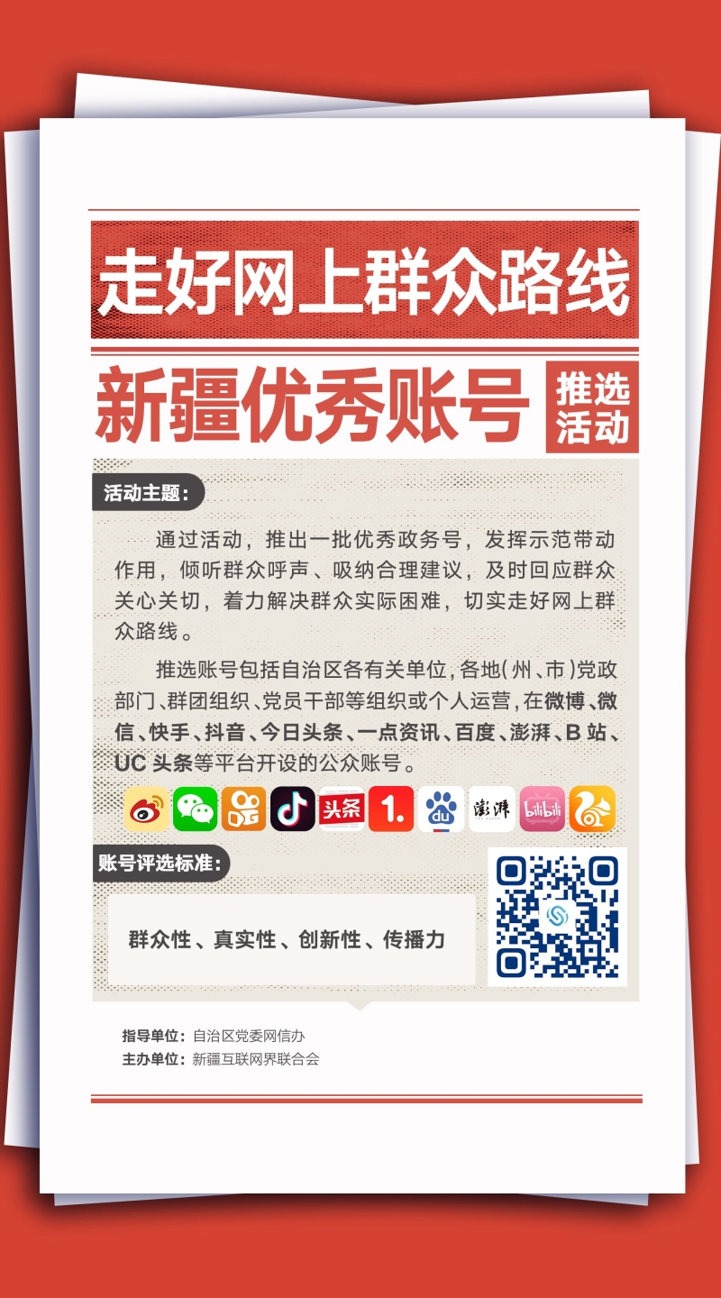 由新疆維吾爾自治區(qū)黨委網(wǎng)信辦指導(dǎo)、新疆互聯(lián)網(wǎng)界聯(lián)合會(huì)主辦的“走好網(wǎng)上群眾路線 新疆優(yōu)秀賬號(hào)推選活動(dòng)”自2022年1月15日正式啟動(dòng)以來(lái),全區(qū)黨政機(jī)關(guān)、國(guó)有企事業(yè)單位廣泛關(guān)注,參與賬號(hào)達(dá)到3200余個(gè)。當(dāng)前,活動(dòng)評(píng)議階段正火熱進(jìn)行中,55個(gè)賬號(hào)脫穎而出,其中“科普新疆”微信公眾號(hào)進(jìn)入終評(píng)環(huán)節(jié)。