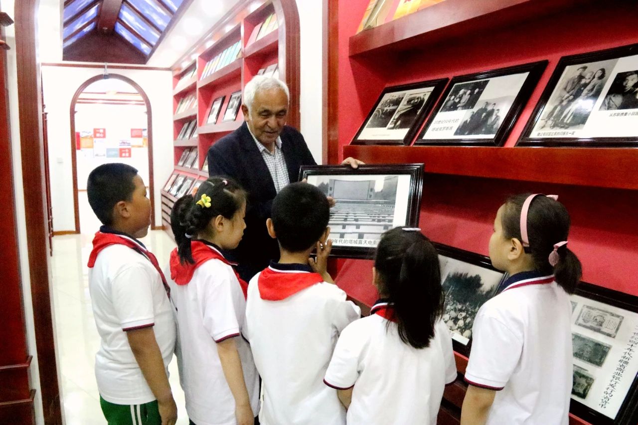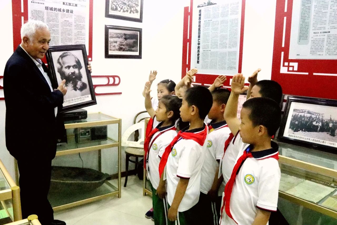 阿地里·阿不都熱合曼在塔城市黨群活動中心西部紅色驛站給塔城市第五小學206班學生講解紅色知識