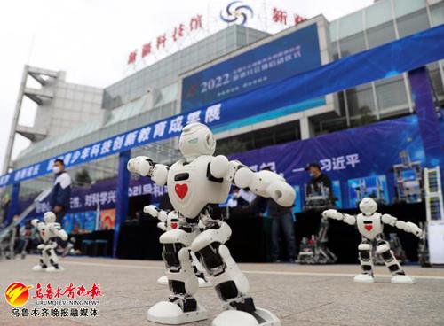 活動(dòng)現(xiàn)場(chǎng),來(lái)自烏魯木齊市第68中學(xué)的學(xué)生正在展示用人型機(jī)器人表演舞蹈。記者陳星宇攝