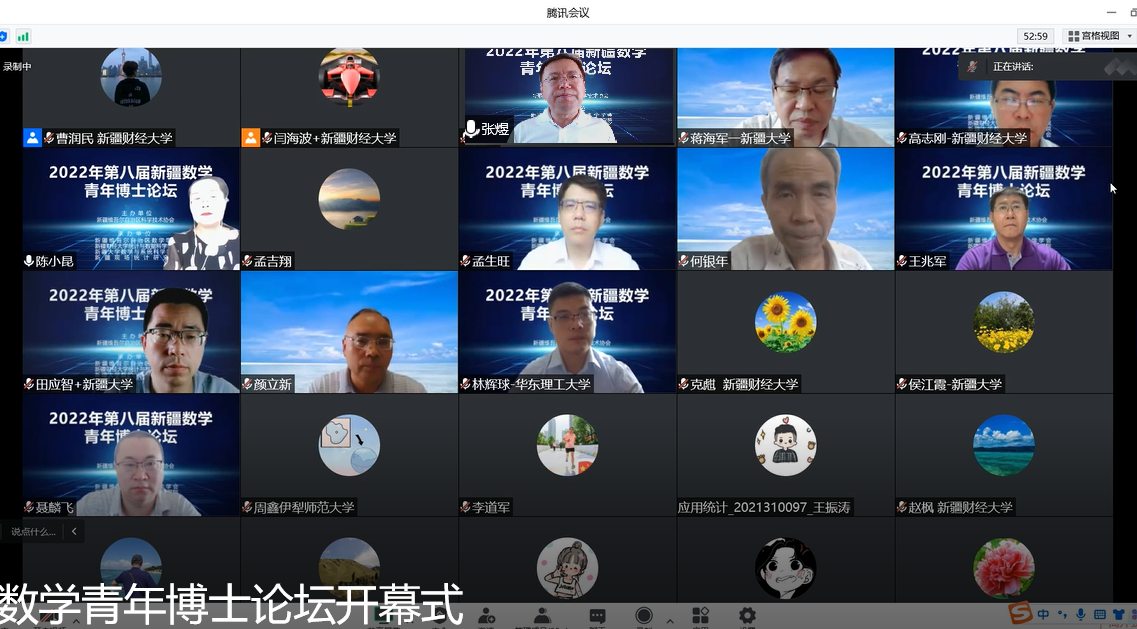 2022年8月13-15日,由自治區科協主辦,新疆數學學會、新疆財經大學等承辦的第八屆新疆數學青年博士學術論壇在線研討會舉行。自治區科協黨組成員、副主席張煜出席論壇開幕式并致辭。