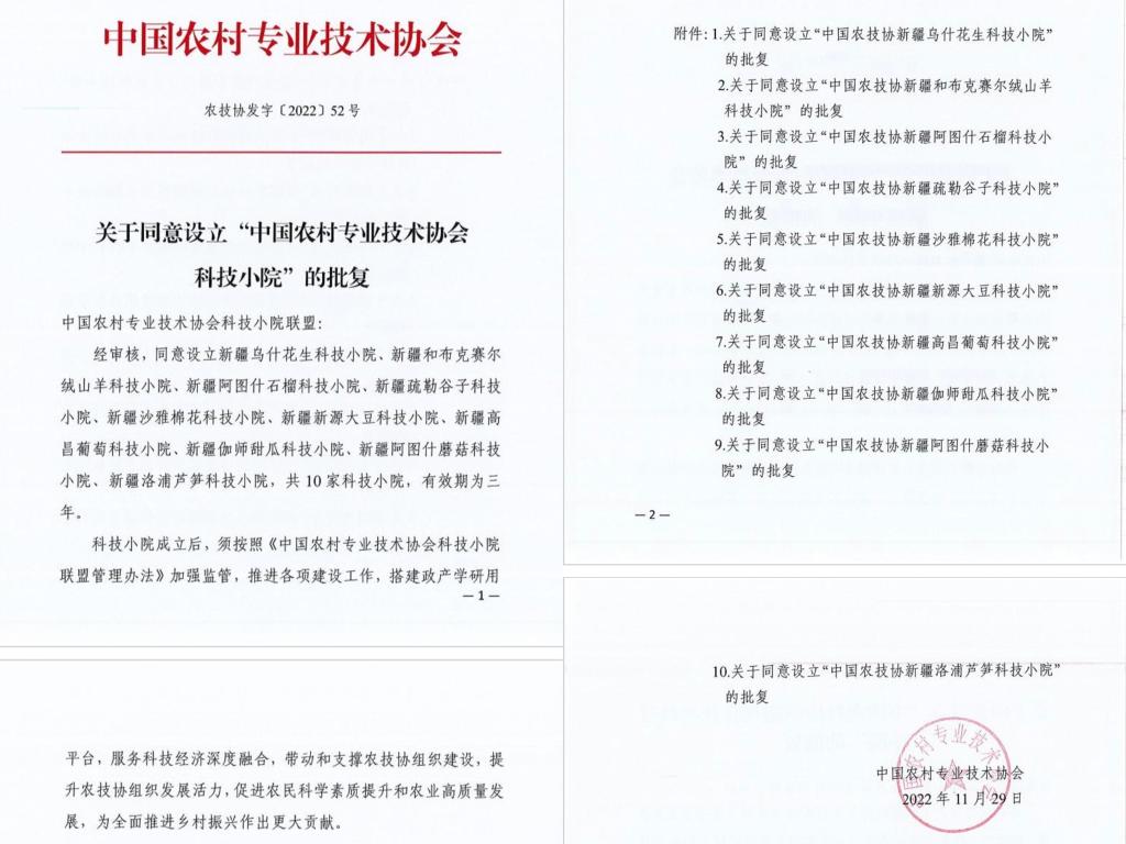 2022年下半年,新疆科協依托新疆農業大學、塔里木大學、新疆大學、新疆農業科學院、新疆畜牧科學院等高校和科研院所,聯合各地、縣科協,圍繞新疆主導產業和特色產業,創建了第三批共10家中國農技協“科技小院”,分別是新疆烏什花生科技小院、新疆和布克賽爾絨山羊科技小院、新疆阿圖什石榴科技小院、新疆疏勒谷子科技小院、新疆沙雅棉花科技小院、新疆新源大豆科技小院、新疆高昌葡萄科技小院、新疆伽師甜瓜科技小院、新疆阿圖什蘑菇科技小院、新疆洛浦蘆筍科技小院。截至目前,新疆共獲批中國農技協“科技小院”30家,覆蓋全疆13個地州市和兵團1個市,創建數量排全國前列。