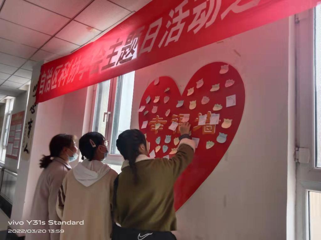 3月20日上午,新疆心理學會與新疆師范大學心理學院共同舉辦“分享我的幸福時刻”為主題的圖片展覽活動。活動中,同學們用拍照的方式記錄了自己最幸福的時刻,并與其他同學分享自己的幸福。與此同時,同學們在“幸福墻”上寫下祝福,祝福自己以及父母、老師等幸福快樂。