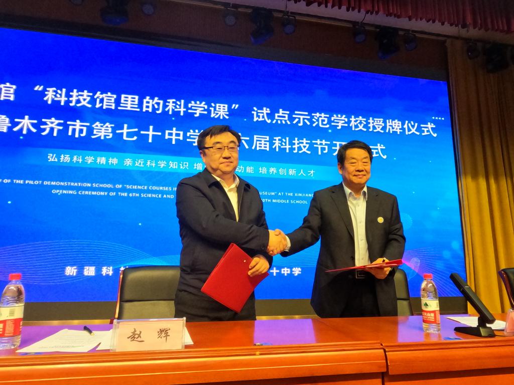 新疆科技館館長(zhǎng)趙輝代表新疆科技館與烏魯木齊市第70中學(xué)、第10中學(xué)、第14小學(xué)和第80小學(xué)簽訂了館校合作戰(zhàn)略協(xié)議,為這4所“館校結(jié)合基地校”代表授牌。同時(shí),希望各試點(diǎn)示范學(xué)校當(dāng)好活動(dòng)的組織者,用好用活“科技館里的科學(xué)課”系列課程,在教育“雙減”中做好科學(xué)教育加法,激發(fā)青少年的好奇心、想象力、探求欲;希望老師們當(dāng)好科學(xué)的傳播者,在“科技館里的科學(xué)課”系列課程上先學(xué)一步、學(xué)深一層,推動(dòng)樹立熱愛科學(xué)、崇尚科學(xué)的濃厚氛圍;希望青少年當(dāng)好創(chuàng)新的接力者,扎實(shí)學(xué)習(xí)科學(xué)知識(shí),掌握科學(xué)方法,樹牢科技報(bào)國(guó)理想,努力實(shí)現(xiàn)學(xué)業(yè)成績(jī)與科學(xué)素養(yǎng)的“雙向奔赴”。