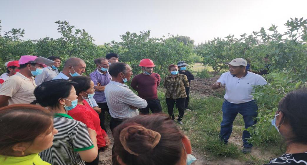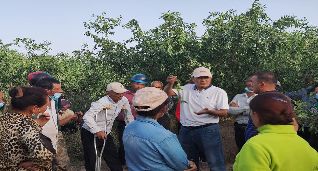 培訓中,玉蘇甫·阿不力提甫副教授深入紅棗地,現場為棗農指導講解了有關紅棗樹形修剪、病蟲害防治、提高坐果率、追肥、棗頭和棗吊處理、水分要求及成熟期采收要求等方面的知識。