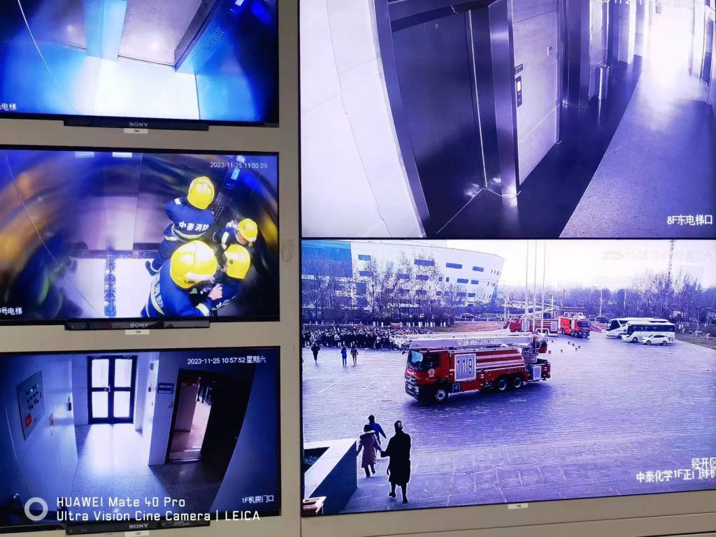 中泰科技樓2023年度滅火及應急疏散演練警情設置:2023年11月25日上午11:00時許,中泰科技樓709辦公室員工誤將未熄滅的煙頭扔至紙簍內,紙簍陰燃并將周邊堆放的紙箱引燃。煙霧觸動煙感報警,消防系統自動控制6-8層卷簾門及電梯門聯動下降,消防廣播啟動播放。709辦公室人員因出口火情嚴重無法逃生,在室外陽臺等待消防登高車救援,其他各樓層人員按照疏散路線及時疏散至指定避難點。疏散過程中有1人腳部扭傷無法自行下樓,需要救治。