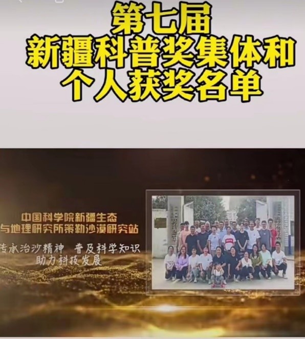 榮獲科普獎集體的策勒站自1983年建站以來,幾代策勒站人經(jīng)過長期的堅守和堅持、拼搏和奮斗、研發(fā)和實踐,在新疆南部(特別是和田地區(qū))的防沙治沙、退化植被修復(fù)、農(nóng)牧民脫貧增收、鄉(xiāng)村振興等方面做出了重要貢獻,同時在維護社會長治久安、宣傳科學(xué)文化知識等方面也發(fā)揮了重要作用。策勒站人形成的“策勒精神”是“生地精神”的重要組成部分,形成的三位一體(科學(xué)研究-科技服務(wù)-科普教育”)的“策勒模式”,讓社會公眾(特別是青少年群體)對科學(xué)、科學(xué)家、科學(xué)院有了更深入和全方位的了解。截至2023年5月,策勒站共獲得各類成果獎15項次(國際獎2項、國家獎3項、省部級獎10項)、獲得各類榮譽稱號20余項次,其中包括獲得聯(lián)合國環(huán)境規(guī)劃署(UNEP)在全球首次頒發(fā)的“全球土地退化和荒漠化控制成功業(yè)績獎”2項,獲得自治區(qū)科技進步特等獎1項,獲得被兩院院士評選的“中國十大科技進展新聞”,獲得全國“五一”勞動獎?wù)拢@得全國創(chuàng)新爭先獎、獲得全國“最美奮斗者”和“最美支邊人”榮譽稱號,獲得自治區(qū)“脫貧攻堅先進個人“榮譽稱號;獲得自治區(qū)“優(yōu)秀共產(chǎn)黨員“稱號;獲得“新疆最美科技工作者”榮譽稱號;獲得“全國防沙治沙先進個人”榮譽稱號等。