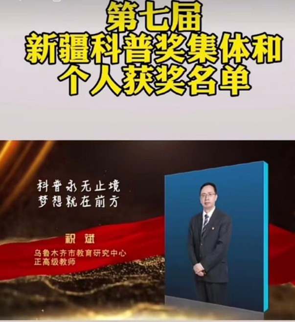 榮獲科普獎個人的祝斌老師,烏魯木齊市教育研究中心中學(xué)地理教研員,中學(xué)正高級教師,新疆師范大學(xué)地理科學(xué)與旅游學(xué)院碩士生導(dǎo)師,新疆地理學(xué)科教學(xué)研究會常務(wù)理事兼副秘書長,新疆地理學(xué)會常務(wù)理事,新疆天文學(xué)會常務(wù)理事,烏魯木齊市中學(xué)地理教學(xué)研究會副理事長兼秘書長,自治區(qū)和烏魯木齊市“國培計劃”、“繼續(xù)教育”授課專家,紅山教育高中地理名師工作室主持人,烏魯木齊地區(qū)高三年級模擬考試地理學(xué)科命題組組長。多年從事中學(xué)地理課堂教學(xué)、教育研究、考試研究工作,在省級以上期刊上發(fā)表論文20余篇,主持或參與多項自治區(qū)級課題研究工作,負責(zé)組織和編寫30余冊教輔資料供全疆師生使用,曾獲自治區(qū)第二屆青年教師地理教學(xué)能手大賽一等獎、首屆自治區(qū)優(yōu)秀中學(xué)地理教育工作者、第九屆全國優(yōu)秀中學(xué)地理教育工作者、自治區(qū)教育廳“送教下基層”活動專家組優(yōu)秀成員稱號,連續(xù)多年參加自治區(qū)高考地理試卷統(tǒng)一閱卷工作和負責(zé)自治區(qū)高中學(xué)業(yè)水平考試地理試卷的統(tǒng)一閱卷工作,積累了較為豐富的高考復(fù)習(xí)備考經(jīng)驗。