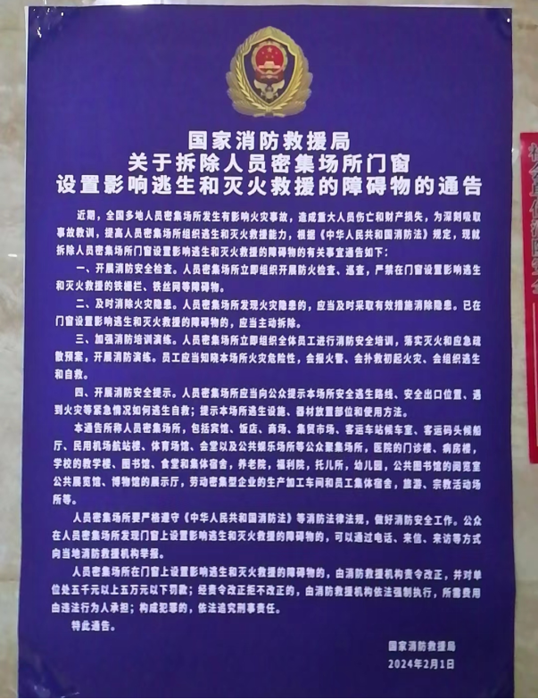 根據國家消防救援局《關于拆除人員密集場所門窗設置影響逃生和滅火救援的障礙物的通告》,新疆消防救援總隊統一安排部署,各地州消防救援支隊積極行動,開展拆除人員密集場所門窗設置影響逃生和滅火救援的障礙物專項行動,對轄區社會單位設置影響逃生和滅火救援的障礙物進行拆除,并張貼相關通告。