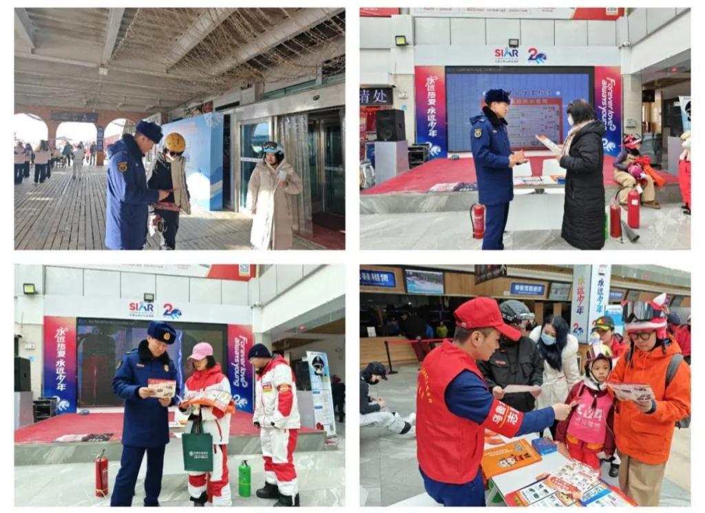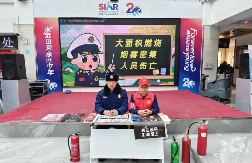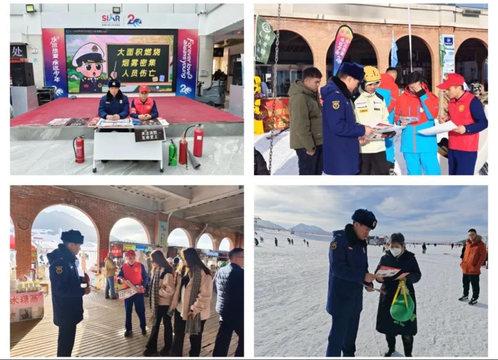 大隊根據不同群體特點分類實施主題宣傳,借力冰雪產業擴大消防宣傳輻射面,結合景區的消防安全特點,消防宣傳人員、消防志愿者、專職消防隊員深入滑雪場、酒店、民宿等場所設置宣傳展臺,給現場游客發放印有消防安全常識的宣傳資料、海報、手提袋等,并通過以案說法的形式講解了近年來在景區常見火災隱患、初期火災處置方法、消防設施使用和火場逃生知識,提醒景區負責人要落實消防安全責任,切實做好日常防火巡查檢查、及時整改火災隱患。