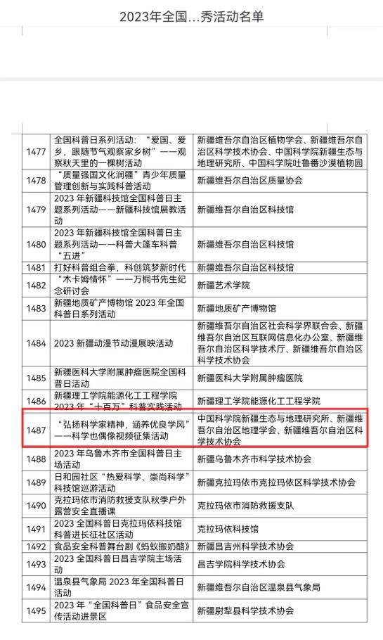2023年11月,該活動(dòng)被新疆科協(xié)選為全國(guó)科普日優(yōu)秀活動(dòng)推送至中國(guó)科協(xié)。經(jīng)綜合評(píng)議,新疆地理學(xué)會(huì)舉辦的“弘揚(yáng)科學(xué)家精神,涵養(yǎng)優(yōu)良學(xué)風(fēng)”---科學(xué)也偶像視頻征集活動(dòng)”被評(píng)為 2023年全國(guó)科普日優(yōu)秀活動(dòng)。