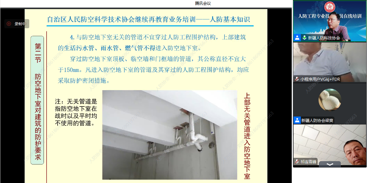 6月7日-9日,新疆人防科技協(xié)會(huì)舉辦全區(qū)人防工程專業(yè)技術(shù)人員在線培訓(xùn)學(xué)習(xí)。培訓(xùn)邀請(qǐng)到國家人防質(zhì)量監(jiān)督總站及新疆人防科技專家?guī)鞂<覐睦碚摵蛯?shí)踐相結(jié)合的角度,分別對(duì)“人防工程防護(hù)設(shè)備常見問題及處理方法”、“人防工程質(zhì)量監(jiān)督要點(diǎn)”、“人防工程質(zhì)量問題預(yù)防與處理”和“人防工程竣工驗(yàn)收程序及五方項(xiàng)目負(fù)責(zé)人職責(zé)”進(jìn)行了系統(tǒng)闡釋,詳細(xì)解讀。