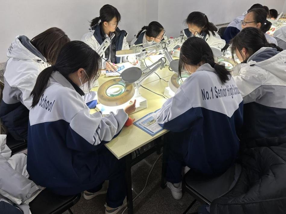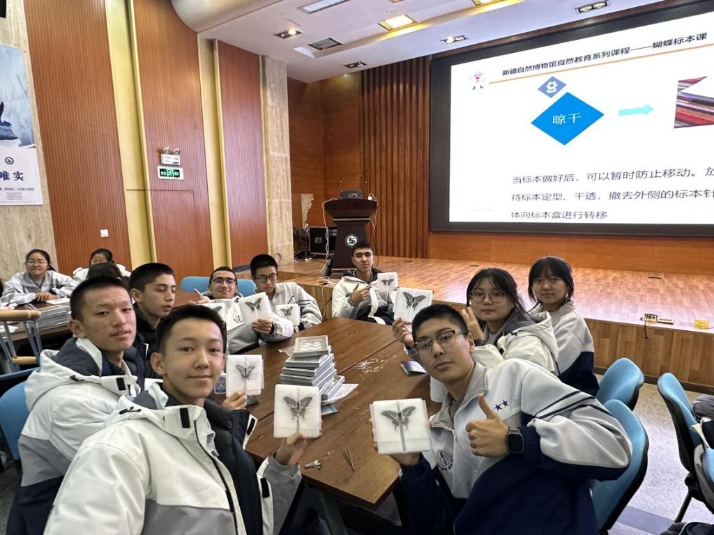 聽完昆蟲講座以后,大家對昆蟲有了基本的了解和認(rèn)知,博物館科普老師于源博、韓雪怡、黃婷婷、孫藝涵給大家開展《美麗的花間仙子--蝴蝶》科普課程,以初識別蝴蝶、蝴蝶的一生為切入點給同學(xué)們普及蝴蝶基本特征、生理結(jié)構(gòu)及生活習(xí)性,深入探索花間仙子-蝴蝶的擬態(tài)。科學(xué)課堂上,同學(xué)們興致勃勃,不僅認(rèn)識了解了更多昆蟲,也親自動手制作了蝴蝶標(biāo)本。通過對昆蟲知識的學(xué)習(xí)及動手實踐更深入了解了生物多樣性及科學(xué)嚴(yán)謹(jǐn)性。同時讓烏魯木齊市第一中學(xué)同學(xué)們走出校園,走進中科院親身動手實踐,為學(xué)科融合起到了帶頭作用。
