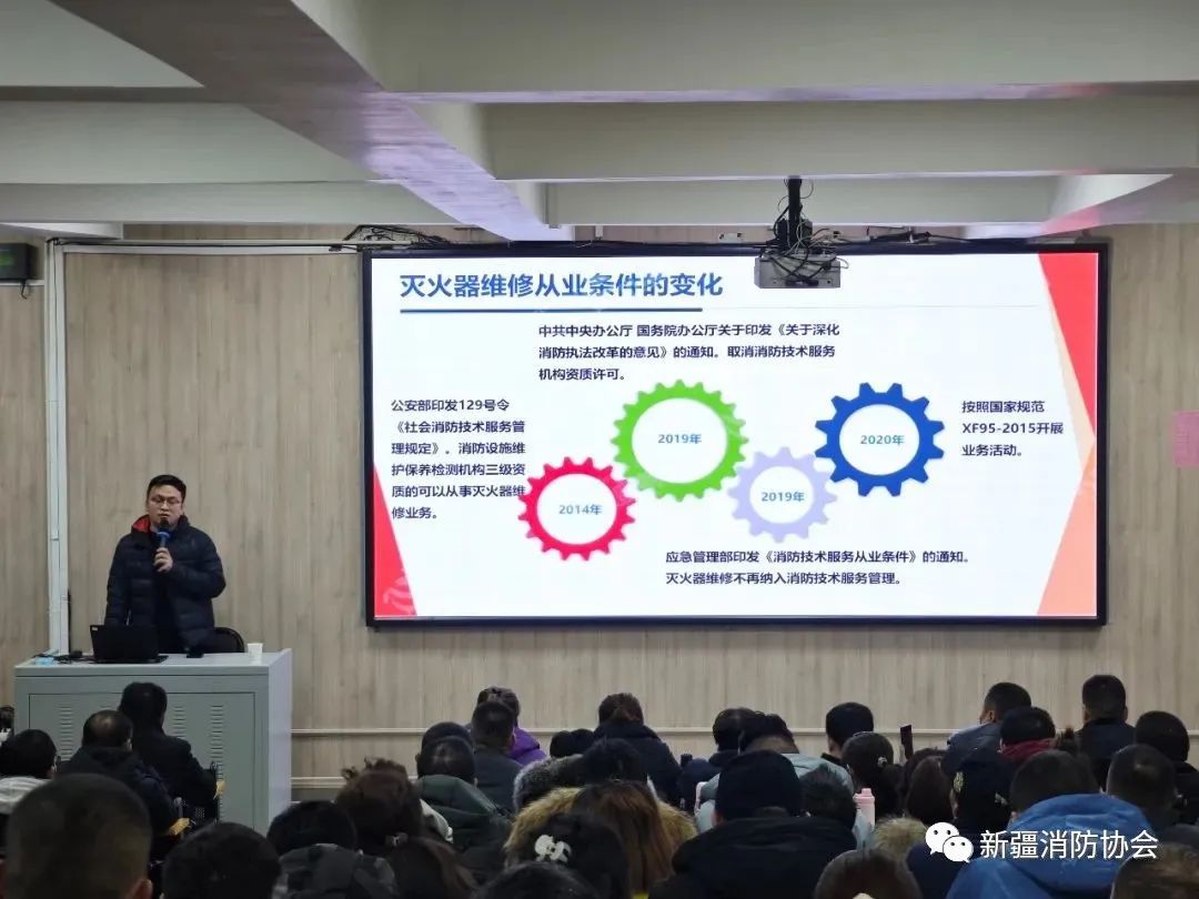 為進(jìn)一步提高我區(qū)滅火器維修人員業(yè)務(wù)素質(zhì)和業(yè)務(wù)能力,增強(qiáng)從業(yè)人員的法律法規(guī)意識,規(guī)范滅火器維修行業(yè)市場行為,2023年12月11日-14日,新疆消防協(xié)會舉辦了2023年度滅火器維修企業(yè)從業(yè)人員業(yè)務(wù)能力提升培訓(xùn)班。協(xié)會專家?guī)斐蓡T、高級工程師李守斌和協(xié)會理事、資深專家蔡軍鳳作為主講嘉賓進(jìn)行專題培訓(xùn)。來自全區(qū)滅火器維修企業(yè)200余名從業(yè)人員參加了第一期培訓(xùn)班。