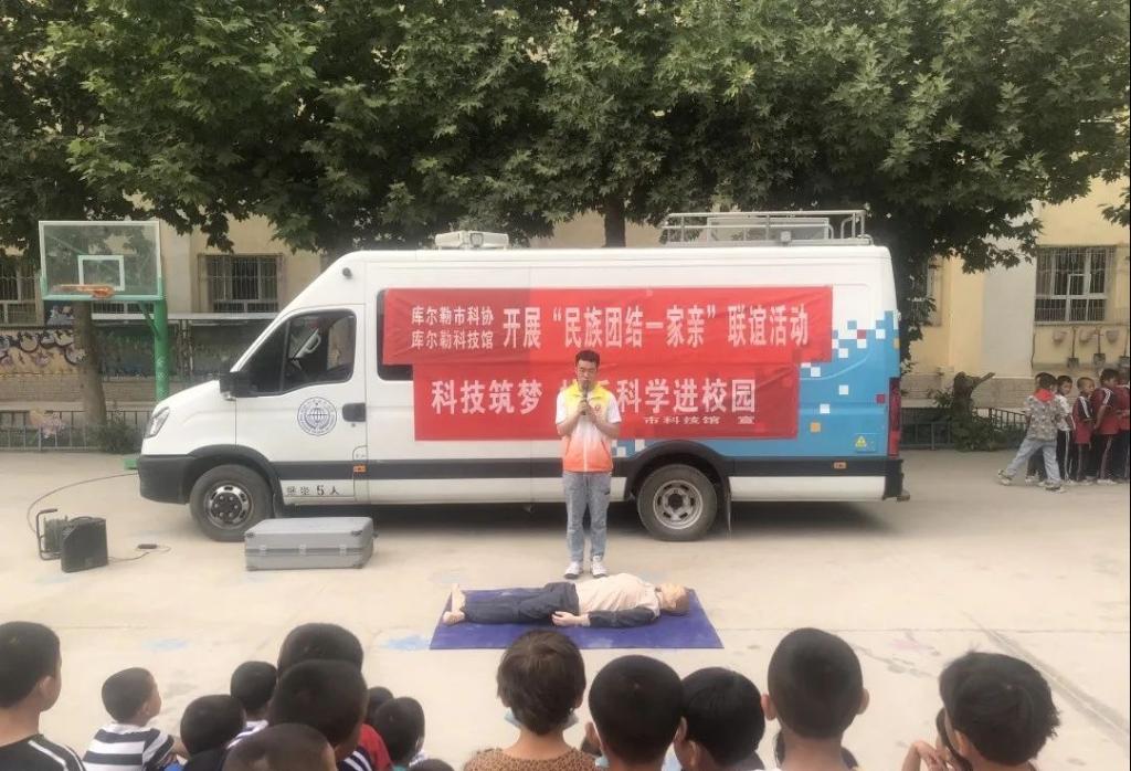 5月25日,庫爾勒“科普大篷車”走進了佳鑫社區和庫爾勒市第十五中學。除3D展板、機器人跳舞、流動展項等科普項目外,科技館還特別準備了應急救護——心肺復蘇術的展示,旨在把切實有用的科普知識宣傳到群眾中,讓大家通過科技活動周走近科學。