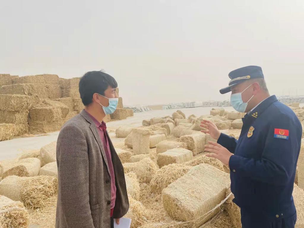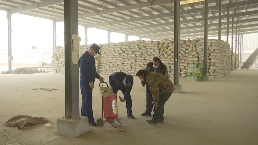 在核桃交易市場,工作人員重點檢查市場內電線、滅火器和消防設施,向工人們講解大風天氣如何避免發生火災和有關消防安全科普知識。
