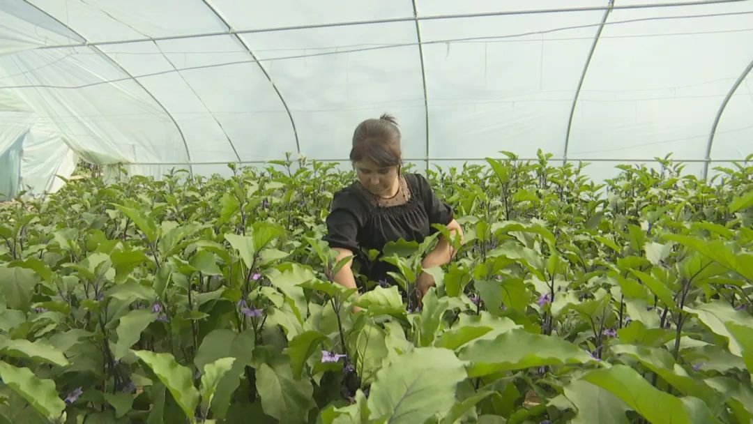 在金果鎮努爾巴格村村民比麗克孜·吐爾洪的溫室拱棚里,色澤鮮亮的茄子生機盎然,比麗克孜·吐爾洪正忙著采收茄子,打包上市。