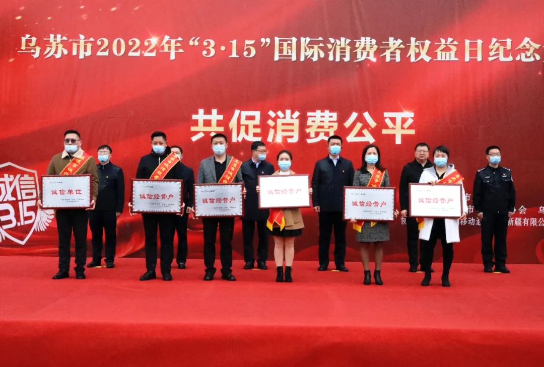 活動現場通報了2021年烏蘇市十大維權案件及消費者權益保護工作情況,并授予烏蘇市德坤機動車檢測服務有限公司等7家公司“誠信單位”稱號,授予烏蘇市婁樓購物鑫福源廣場店等11家企業“誠信經營戶”稱號。