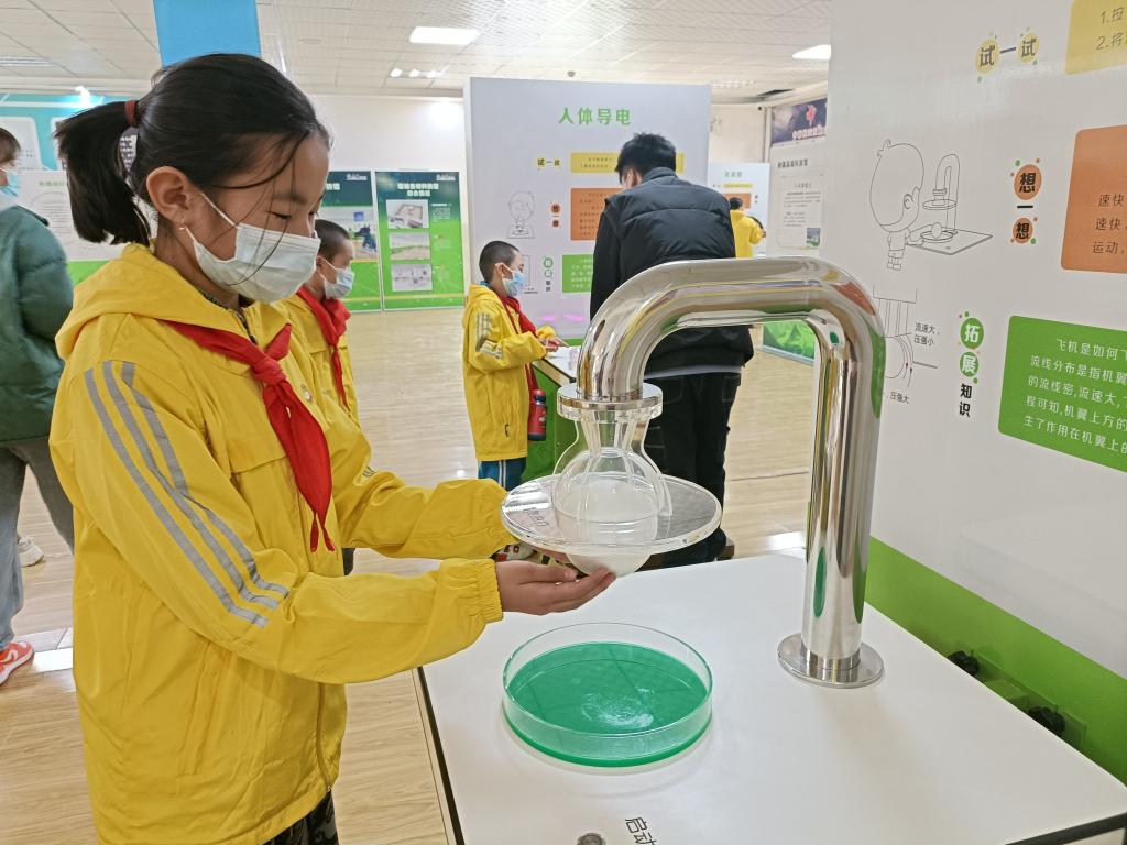 一走進基礎科學體驗展區,同學們就紛紛迫不及待地走向了自己感興趣的展具前,動手摸一摸、看一看,始終不得要領,通過館內講解員的講解,同學們臉上都露出恍然大悟的神情。