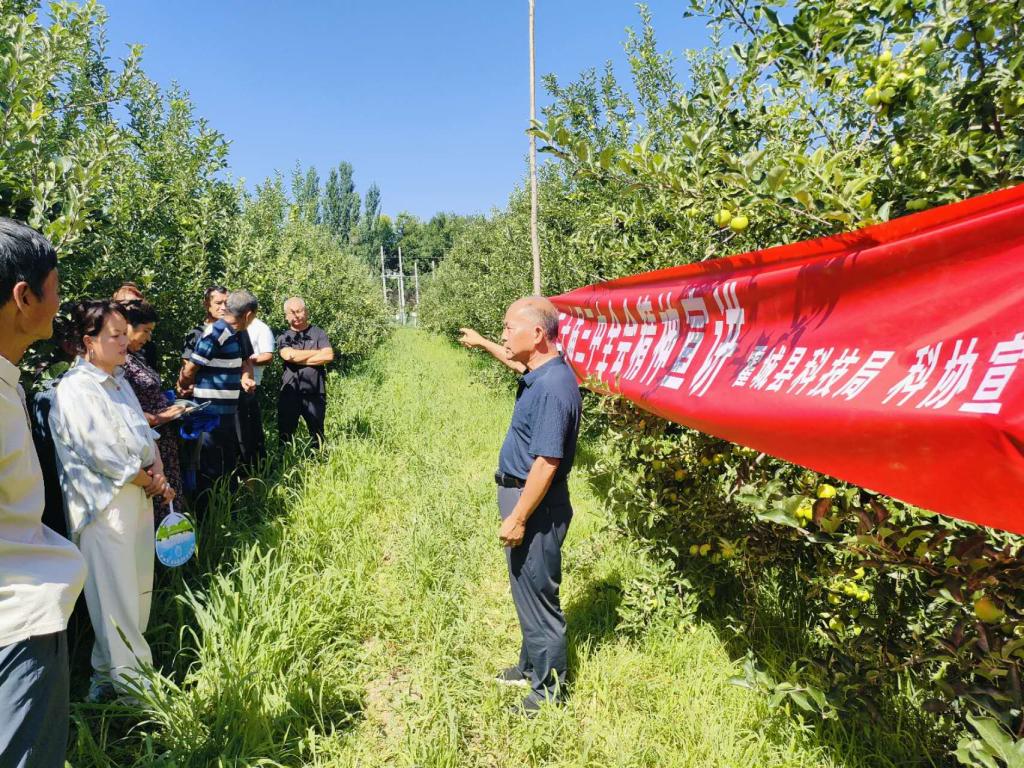 7月23日,霍城縣大西溝新村果農頂著如火的太陽正在學習蘋果田間管理技術。十多戶林果種植戶在聽到消息后,自覺來到果園現場聽講。