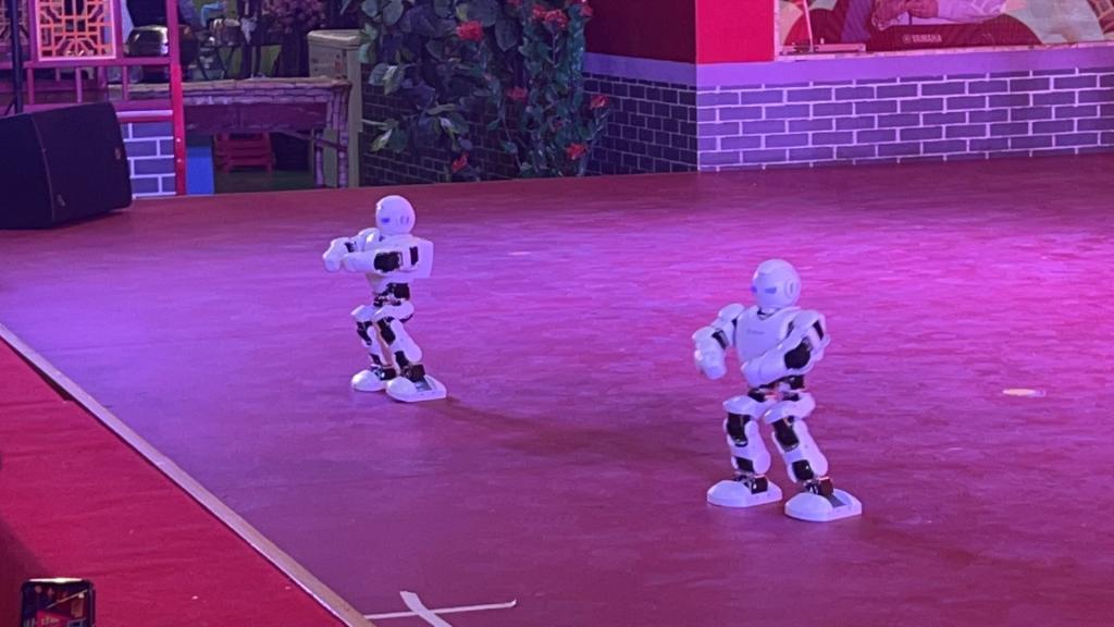 “好神奇,它們的動作好整齊。”一位小朋友目不轉睛地盯著舞臺上,一曲《小蘋果》跳完,另一曲《江南style》又開始了。看著機器人酷炫的動作,臺下的小朋友們也跟著學起來。