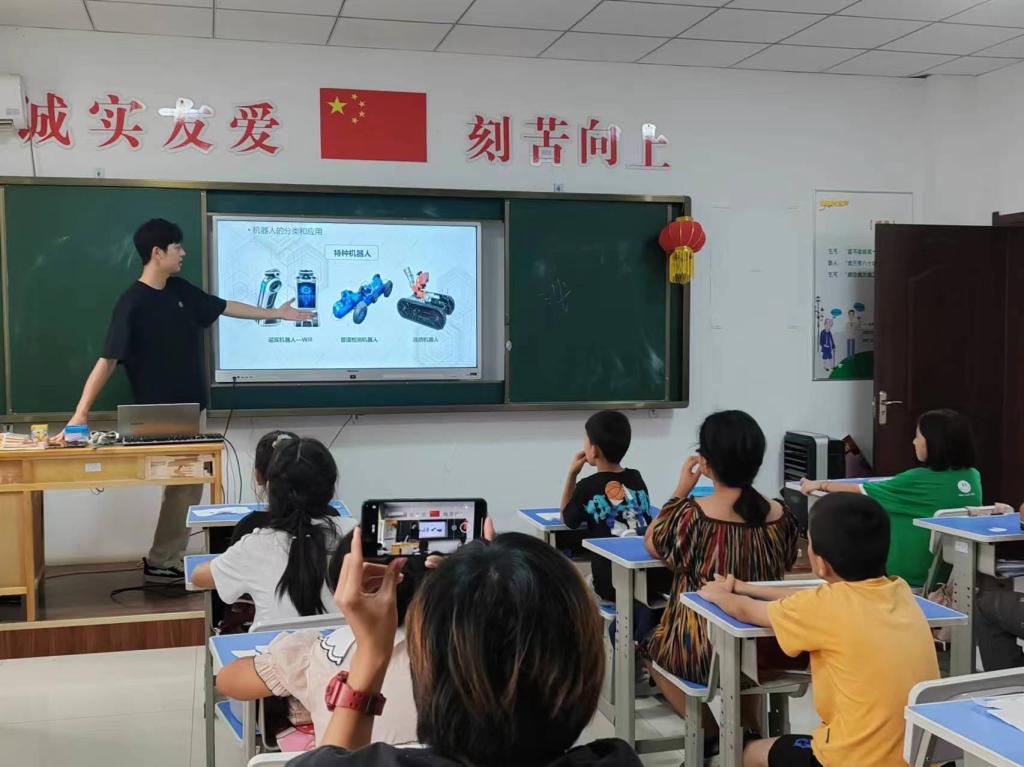 同學(xué)們聽得認真,思想活躍。“大家覺得什么是機器人啊?”“大家知道的科學(xué)家都有哪些呢?”組員拋出問題,同學(xué)們爭先恐后地回答。組員們對他們的回答表示充分認可,并做了補充,雙方的互動營造了融洽氛圍,大家于歡樂中結(jié)束了科普。