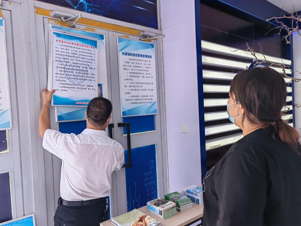 7月1日若羌縣科協到若羌縣若羌鎮、吾塔木鄉、鐵干里克鎮、瓦石峽鎮的8個鄉村科普館,就農村科普館建設、科普教育示范基地建設等工作進行實地走訪調研,為鄉村科普館統一制作科普館組織結構圖、若羌縣鄉村科普館展品展項維護制度、若羌縣鄉村科普館消防安全管理規定等科普工作制度,并分發給各科普館張貼上墻,若羌縣科協主席強調要堅決貫徹州科協關于進一步加強基層科普服務能力建設要求,確保若羌縣科普工作在加強農村科普宣傳、增強農民科學素質等方面為實施鄉村振興戰略夯實基礎。