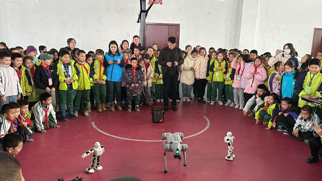 在二樓機(jī)器人表演,科技輔導(dǎo)員操作著遙控手柄,為學(xué)生們上演了精彩的機(jī)器人表演串燒,經(jīng)典舞曲“小蘋果”“江南Style”“黑走馬”等勾起了現(xiàn)場激烈熱情的回應(yīng)和互動。“笨笨”機(jī)器狗還為孩子們表演了“比心”“翻跟頭”,深受孩子們的喜歡。