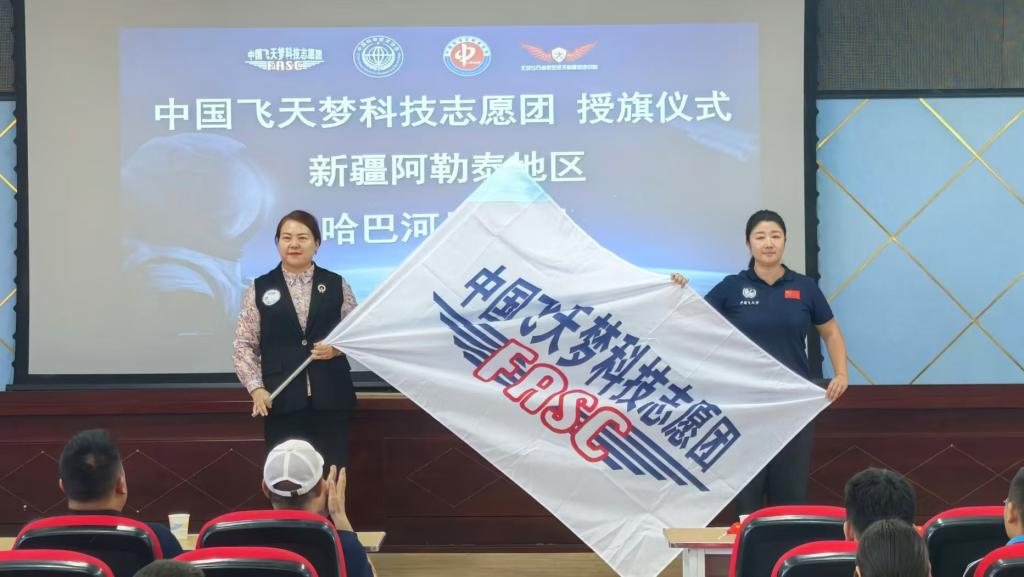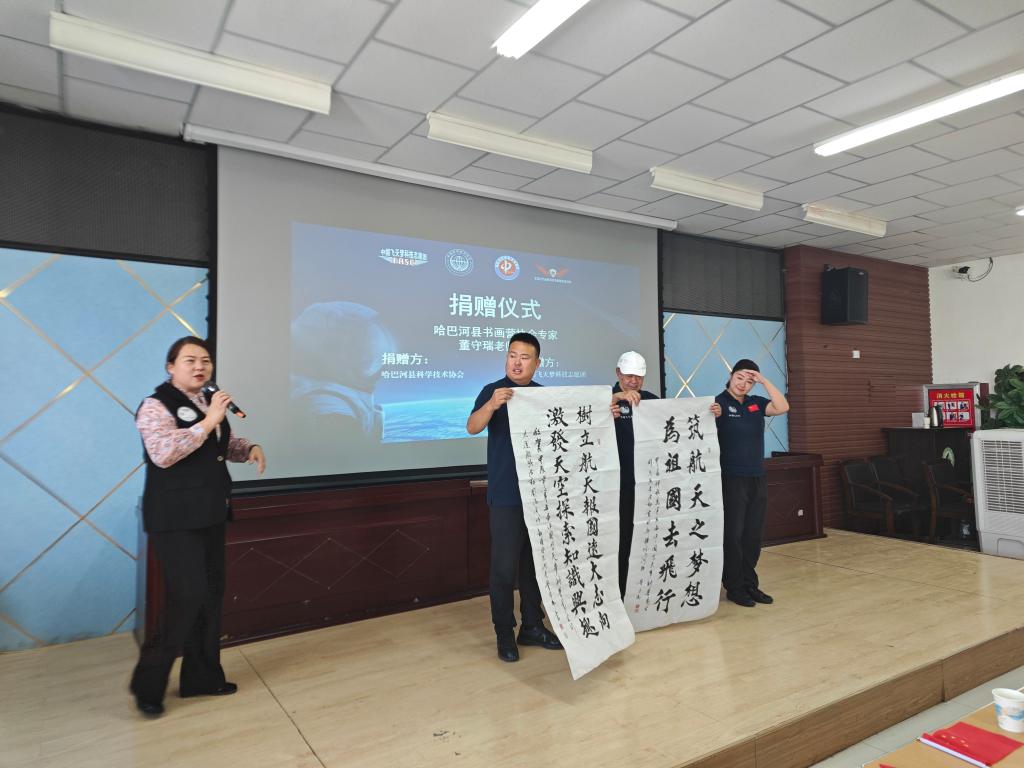 活動中,哈巴河縣科協(xié)向中國飛天夢科技志愿團(tuán)贈送哈巴河縣書畫營協(xié)會專家董守瑞老師的親筆書法作品。中國飛天夢科技志愿團(tuán)副團(tuán)長張海同志向阿勒泰地區(qū)哈巴河縣大隊(duì)進(jìn)行授旗。