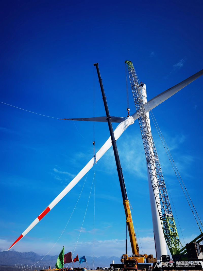新疆金風科技股份有限公司吊裝風機現場(資料圖片)。石榴云/新疆日報記者趙悅攝