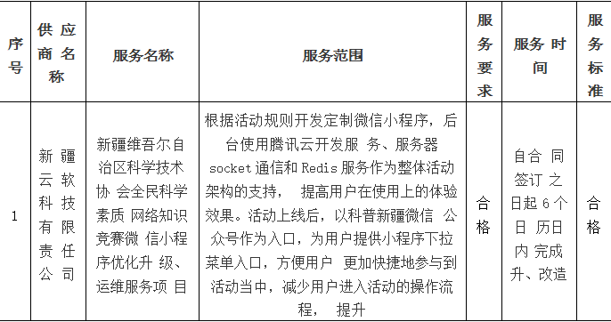 二、項(xiàng)目名稱(chēng):新疆維吾爾自治區(qū)科學(xué)技術(shù)協(xié)會(huì)全民科學(xué)素質(zhì)網(wǎng)絡(luò)知識(shí)競(jìng)賽微信小程序優(yōu)化升級(jí)、運(yùn)維服務(wù)項(xiàng)目