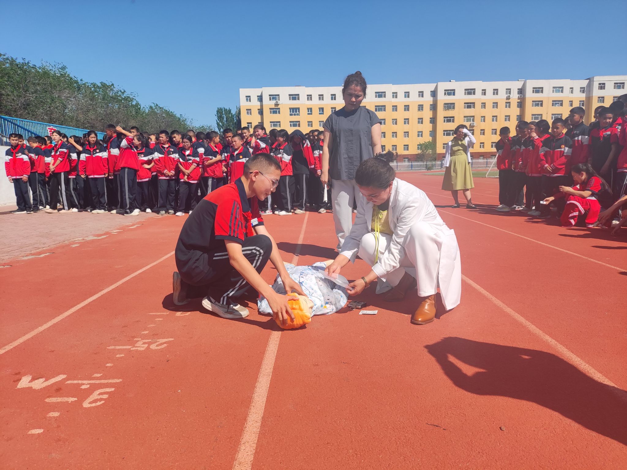 活動現場,額敏縣紅十字會應急救護培訓師通過模擬真實場景,用通俗易懂的語言和逼真的模擬道具,為學校2000余名師生講解了心肺復蘇、海姆立克急救等急救操作。為了增強學生們的體驗感,應急救護培訓師現場進行示范,并邀請學生們上臺實踐操作,使學生們更好地掌握了急救知識和技能。