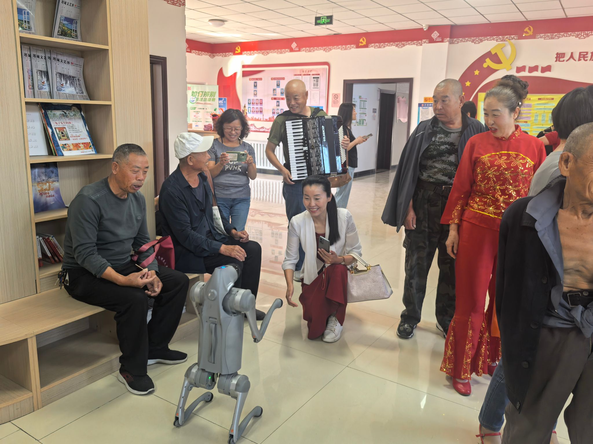 杜別克街道花園社區一樓活動中心義診點,在市民排隊等候期間,市科協帶來的智能機器人和機器狗成為最受歡迎的“科普使者”,為排隊等待血壓檢測的居民帶來了別樣的科技體驗,科技感十足的互動形式不僅緩解了排隊等待的枯燥,更有效提升了科普宣傳的趣味性和接受度。