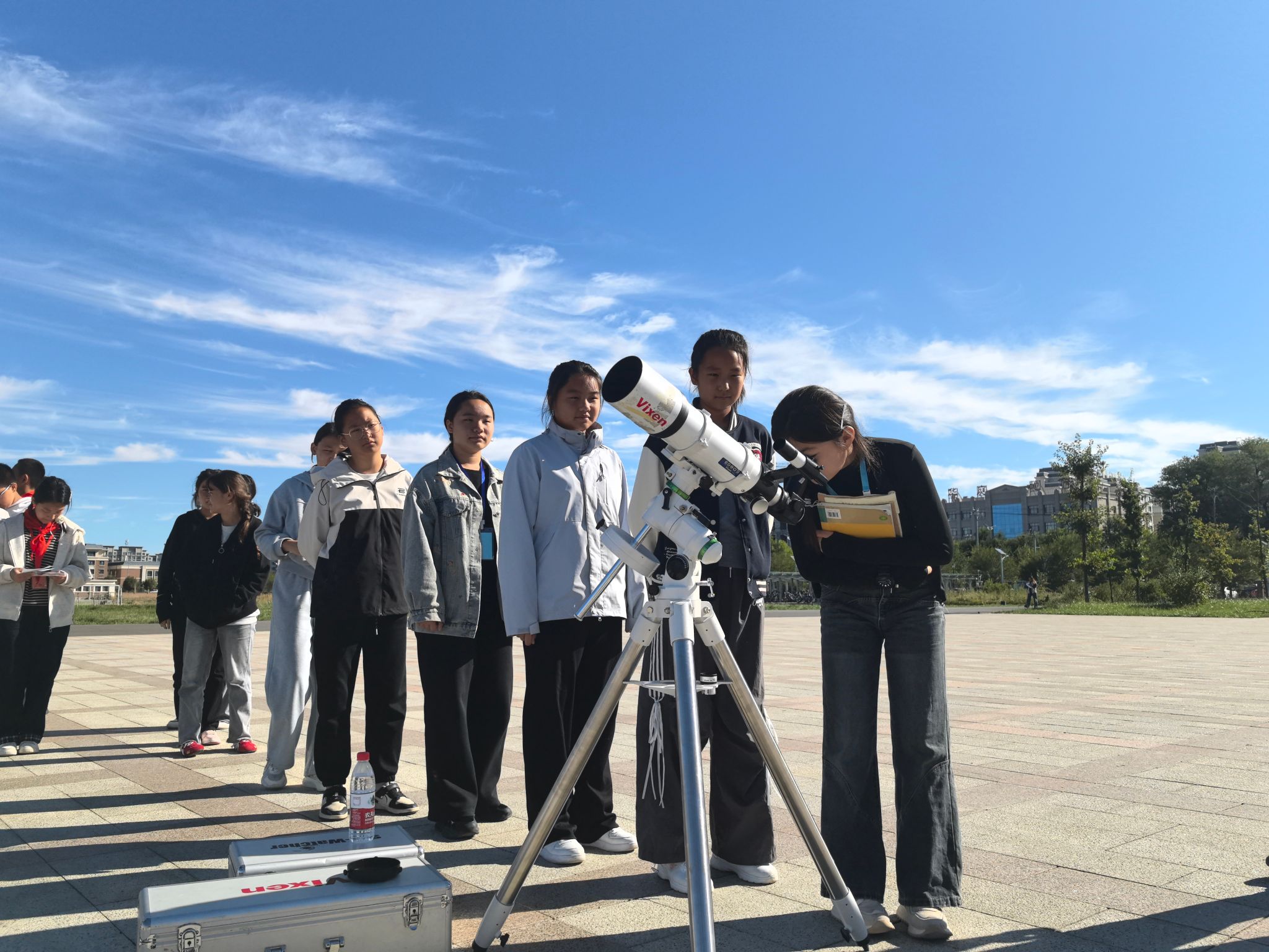 實操體驗環節更是讓活動氛圍達到高潮。專家們帶來的專業觀測設備深受同學們的喜愛。在塔城市第四小學的操場上,科技工作者手把手指導學生操作天文望遠鏡,調整焦距、對準天體,當孩子們通過鏡頭清晰看到太陽黑子的輪廓、月球表面的環形山時,興奮地互相分享觀測發現。“原來月亮上的‘坑’這么大!”“太陽上真的有黑色的斑點!”稚嫩的驚嘆聲中,科學的種子悄然種下。